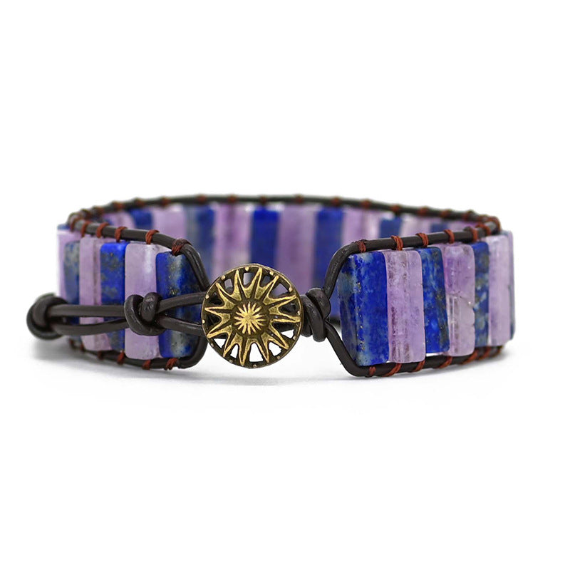 This wrap bracelet of braided leather with amethyst and lapis lazuli enhances mental calm, intuition, and spiritual connection . Bohemian elegance with protective energy.
