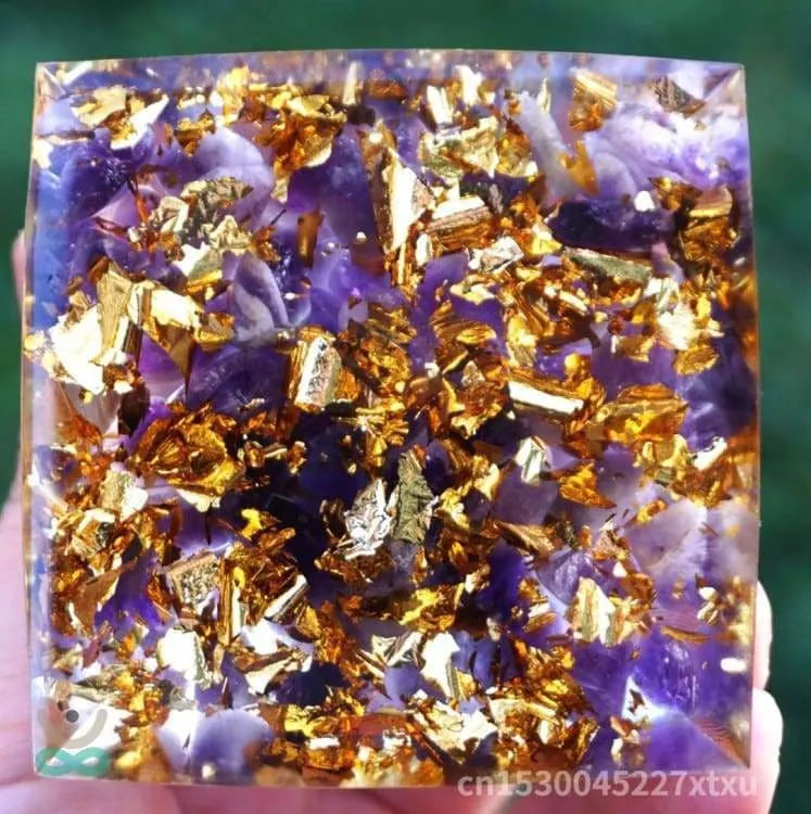 Immerse yourself in the universe of positive energy with this handcrafted Orgonite Pyramid , made with rutilated quartz, amethyst, citrine, tiger's eye, and genuine gold leaf. Every detail has been carefully designed to delight your senses and raise the vibration of your space.
