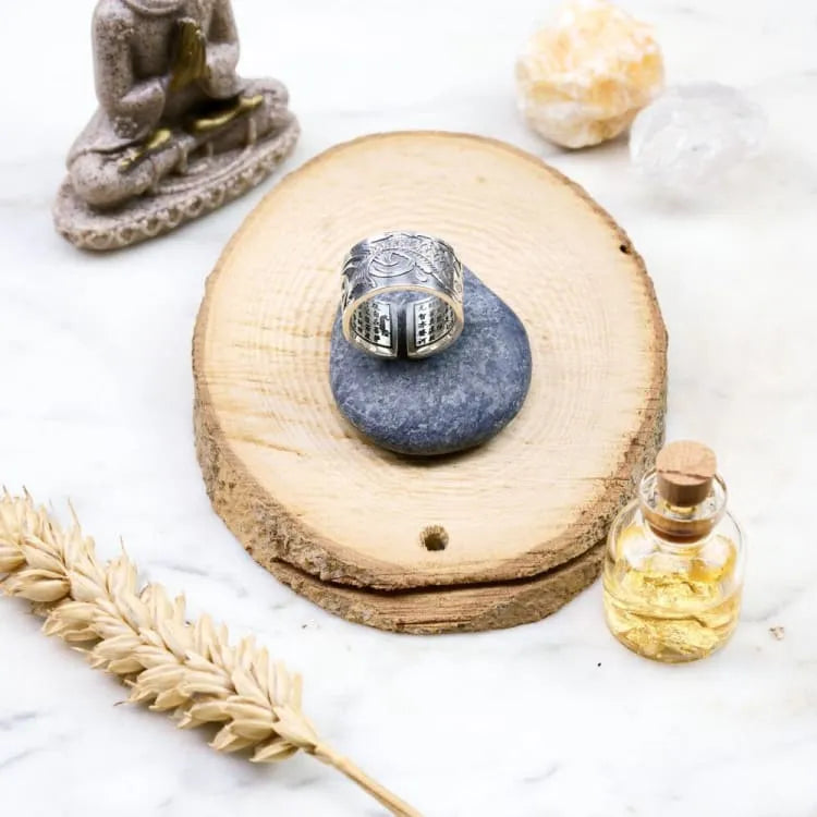 This ring, made of silver and steel, features two fish. This pair is an ancient Buddhist symbol representing happiness and fulfillment as they enjoy complete freedom in the water. They are also a symbol of fertility and abundance.